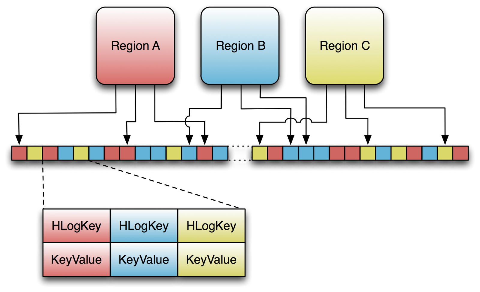 Данные автоматически нарезаются на поддиапазоны ключей - tablet - блок данных для раскладки в кластер и регулировки нагрузки.